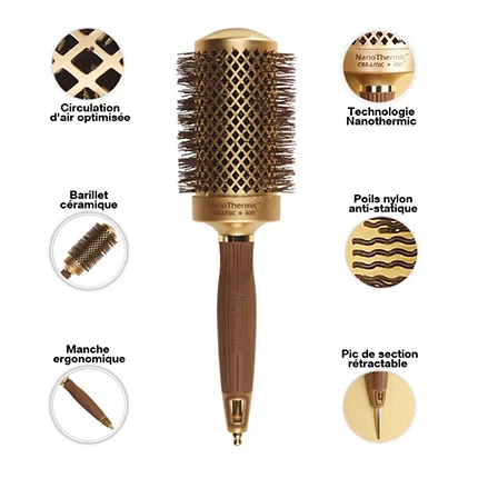 Les brosses Nano thermic associent les technologies ionique, tourmaline, cĂ©ramique et nano-thermique pour un rĂ©sultat de coiffure parfait. Ses grandes entrĂ©es d’air permettent une meilleure circulation de l’air offrant une rĂ©partition uniforme et rapide de la chaleur. Les poils ionisĂ©s en nylon