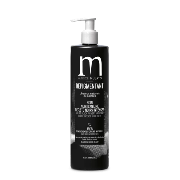 « Soin crème repigmentant noir d’aniline, reflets noirs intenses.