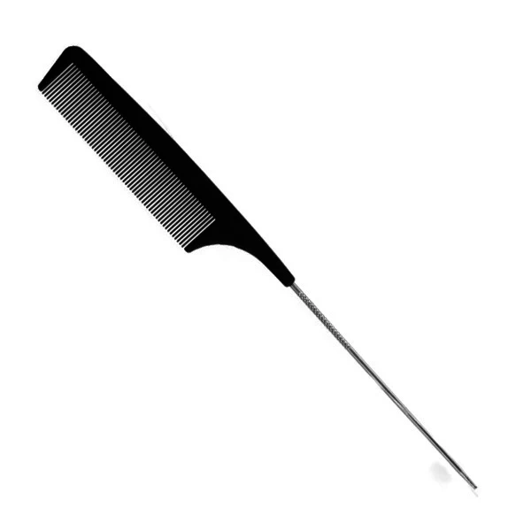 Peigne à queue en métal et Carbone. Antistatique. L’indispensable outil dans vos trousses! Ce peigne à queue est pratique et polyvalent, il vous aidera dans toutes vos coiffures. La partie à dents permet de donner du volume et de démêler les cheveux alors que la partie queue permet de séparer les mèches et de faire des raies nettes et précises!